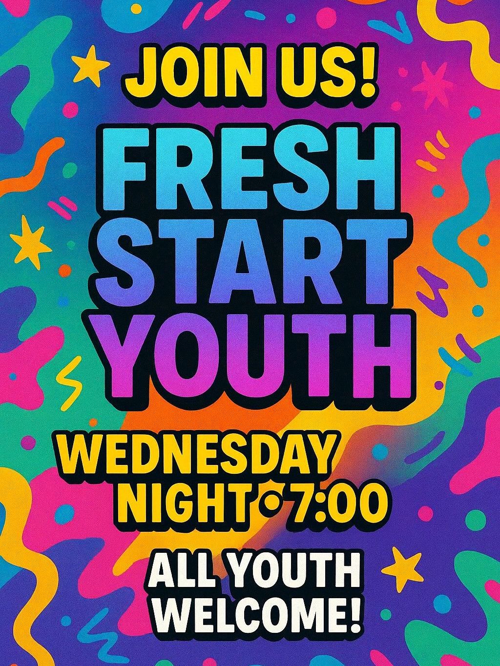 Join Fresh Start Youth every Wednesday at 7:00 PM! A place to have fun, make friends, and grow in faith. Come as you are and discover your purpose! Your fresh start begins here!